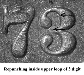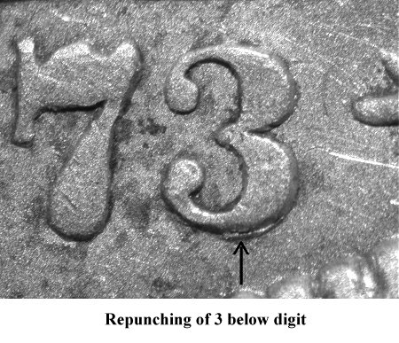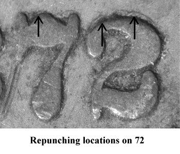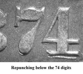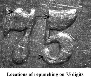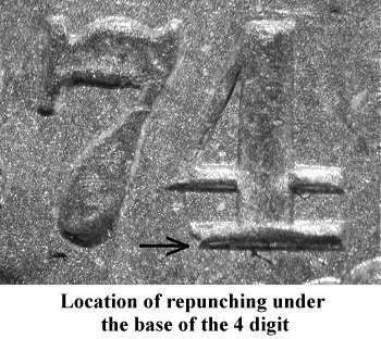 Repunching is seen below the base of the 7 and 4 digits. | |||