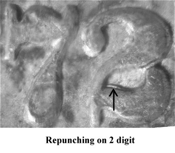 Repunching is seen directly below the bottom of the upper loop of the 9. This repunching is parallel to the bottom of the upper loop and is similar to the repunching seen on F-106. | |||
