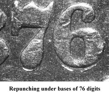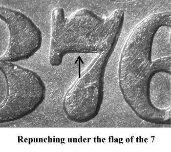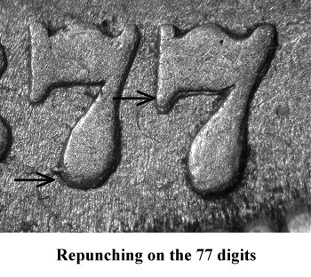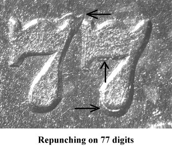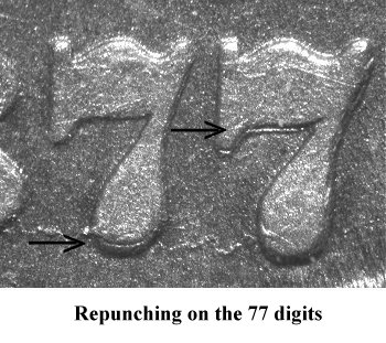 The 77 digits are repunched multiple times but primary area seen for this die pairing is below the flag of final 7 digit. | |||