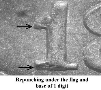 Business Strikes; Repunching is visible above the flag of the 1 digit. | |||