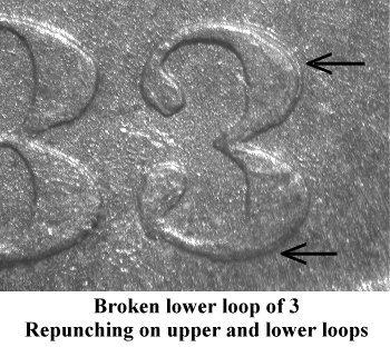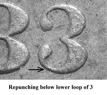 Repunching below the base of the 3 digit should be easily seen. | |||