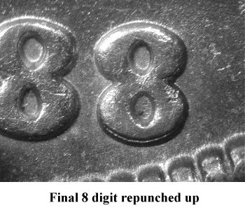Repunching is seen about the flag of the 1 digit and above the top loop of the 8 digit. | |||