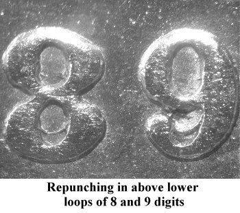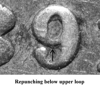 Repunching is visible inside the 8 and 9 digits. Look inside and near the top of the lower loops. | |||