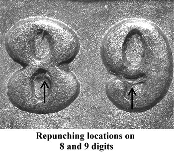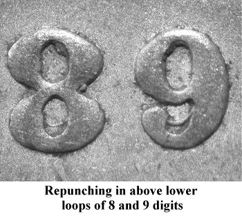 Repunching is boldly visible inside the 8 and 9 digits. Look inside near the bottoms of the lower loops. | |||