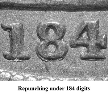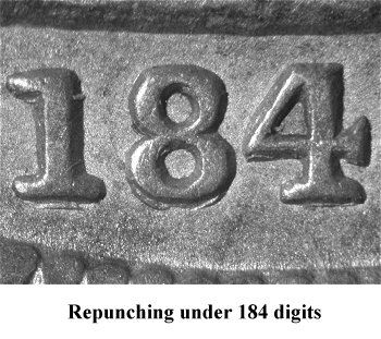 This variety is easily identified by bold repunching under the 184 digits. This obverse is paired with Reverse C. | |||