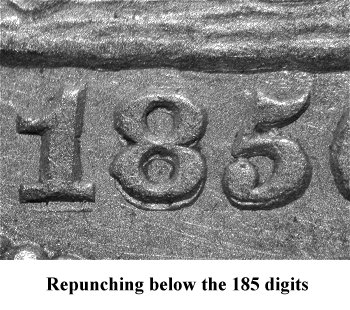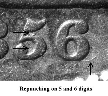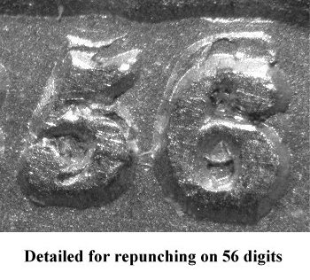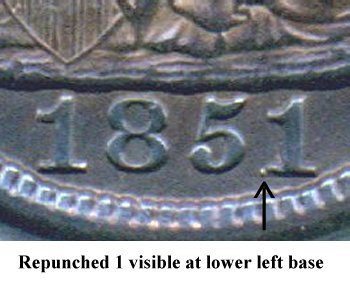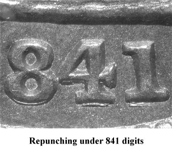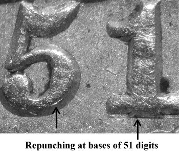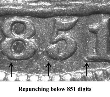 Repunching is seen below the base of the 851 digits. The strongest repunching is below the left foot of the 1 and will remain visible in later die states. | |||