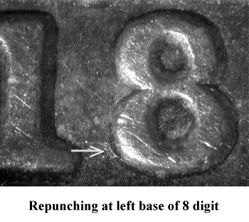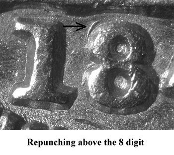 On well struck examples, faint repunching can be seen at the lower left base of the 8 digit. | ||||