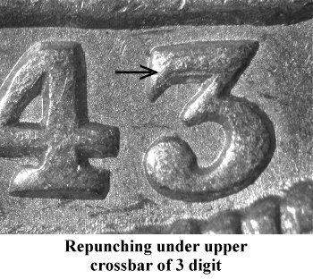 The 3 digit in the date is repunched north, look under the top crossbar for evidence of first punch. | ||||