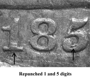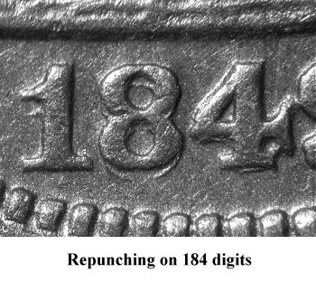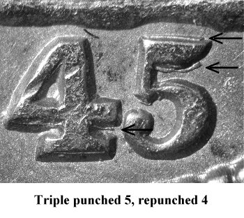This variety is typically described as 1845/1845 in numismatic pricing guides since all four digits show signs of repunching. | |||