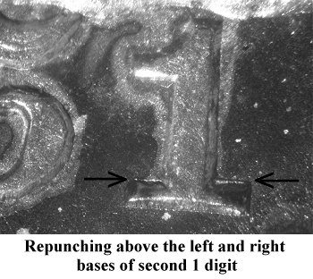 The second 1 digit is repunched down with residual traces of the prior digit visible above the right and left base. | ||||