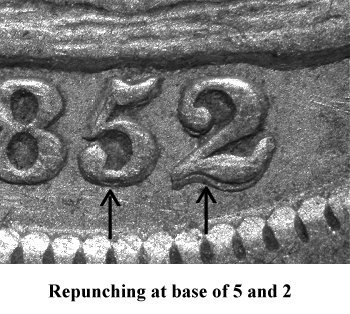 An obverse die with bold repunched 5 and 2digits is initially paired with a reverse die exhibiting a weak legend. | ||||