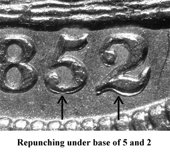 In later die state, the obverse with repunched 851 digits only shows repunching at the lower left base of the 1. There is different reverse die pairing during later die state. | ||||
