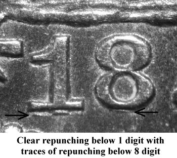 Repunching on 1 and 8 digits is seen under the flag of the 1 digit and above the top loop and within the cross segment of the 8 digit. | ||||