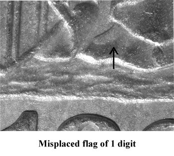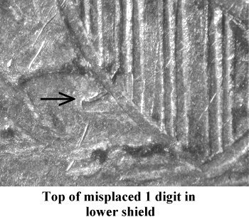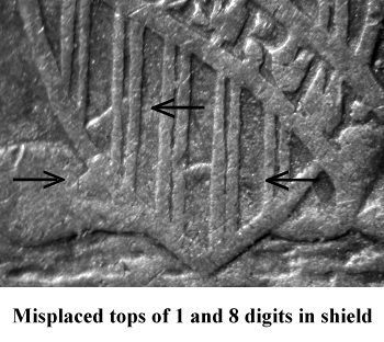 Comments: Extra tops of two sets of 18 digits are visible in the lower shield. The first flag of 1 digit is located between the bottom of shield line #2 and intersecting shield line #3 and #4. The second flag of 1 digit is directly below the first and peeks out to the left of the shield. Adjacent to the second flag of 1 digit is the top loop of 8 digit bisects shield lines #7 and #8. Discovered by Jim Smith and first presented to Gerry Fortin for publication at the 2012 FUN show. I've already seen three examples of this variety in early and late die states. This variety is presently considered to be scarce but can be located with some searching.