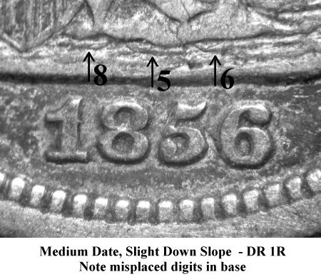 Comments: There are a host of different obverse dies employed to strike 1856 Small Date coinage. Locating examples of the F-107 variety with misplaced bases of the 856 digits is challenging as one needs to carefully study the base under the gown lines for these digits. An easier approach for locating this variety is using the date position with respect to the pendant and the basic denticle ruler measurement (DR 1R). With practice, one can locate this challenging MPD variety. This variety is listed in the Ultimate and MPD sets. I have yet to see a Mint State example. Discovered by Bill Bugert and first published in Brian Greer's Guidebook.