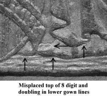 Comments: An extra top loop of an 8 digit is seen in the lower gown directly right of the pendant. This misplaced top loop is positioned directly above the final 8 digit in the date. Larry Briggs first reported this variety in the Gobrecht Journal during the 1990s with the variety becoming available due to its popularity from inclusion in the Top 100 and Ultimate varieties sets.