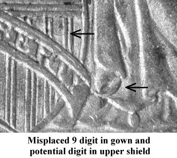 Comments: An extra tail of a 9 digit is seen on the gown fold to the right of the scroll end. The extra 9 digit is obvious and can be easily cherrypicked. Gerry Fortin first identified this MPD variety during 1991 and published in Brian Greer's Guidebook. This variety is also listed in the Top 100 and Ultimate Varieties set. Due to its popularity, the variety is difficult to locate as most have been found and "put away" in collections.
