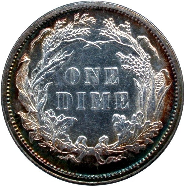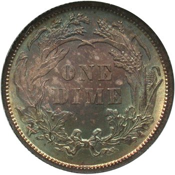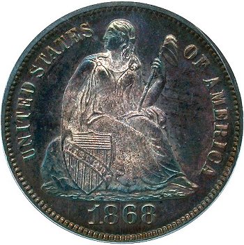 Comments: First listed by Kam Ahwash in his Encyclopedia on Liberty Seated Dimes. There are at least two extra bases of misplaced 1 digit in the base directly above the final 18 digits. All examples seen were on proofs until the author located a raw business strike example (F-105a) and had PCGS confirm the dime was a business strike during the late 1990s. Since then, no other business strike examples have surfaced to the author's knowledge. The 1868 F-105 MPD variety is listed in multiple variety sets including Top 100, Ultimate and the MPD set. It is expensive as a proof strike but can be located with some searching.