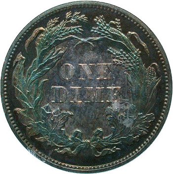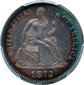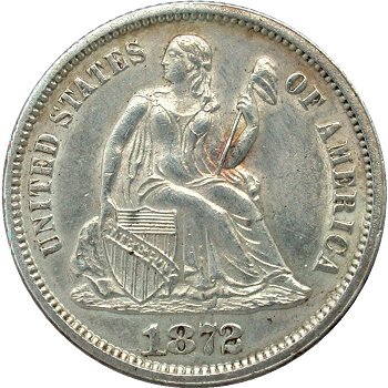 Comments: Discovered by Kamal Ahwash and first listed by Brian Greer in his Guidebook on Liberty Seated Dimes. The extra base of 2 digit can be found in the base directly below the pendant. Since the discovery of the extra 2 digit, this obverse die has been studied further. The date exhibits repunching on the 72 digits and on high grade proof specimens, one can see two addition tails of the 2 digit immediately to the right of the primary misplaced 2. The obverse die was used for proof and business strikes. F-109 is the designation for proofs and F-109a for business strikes (see next listing). I've decided to list the proof and business strikes as separate listing in the MPD set due to their rarity and interest levels. Included in the Top 100 and Ultimate varieties sets.