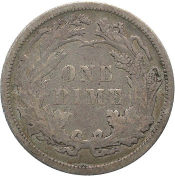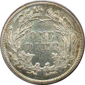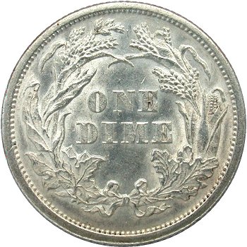 Comments: The bold top of 1 digit is easily seen in the denticles below the final 8 digit. This variety well illustrates the fact that misplaced digits can be found within the denticles below date digits on Seated dimes. With careful searching, this variety can be located in most grades though mint state examples remain rare. Credit is given to Chris Pilliod and Terry Searcy for first publishing this variety after locating an example during the 1991 Winter FUN show. Also including in the Top 100 and Ultimate varieties sets.
