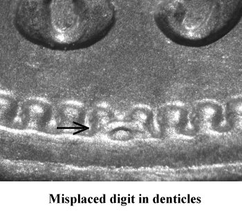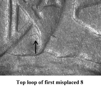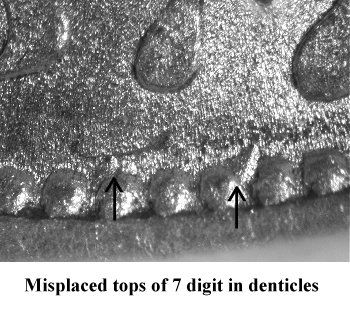 Comments:The top loop of an 8 or 9 digit is visible in the denticles at a point below the 8 and 9 digits. This variety was discovered by Bill Fivaz and currently part of the Top 100 and Ultimate varieties sets. A popular variety that can be located with some careful searching.