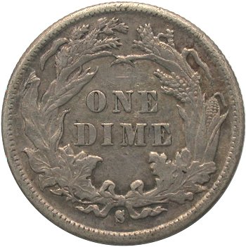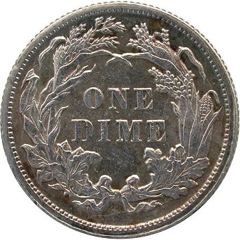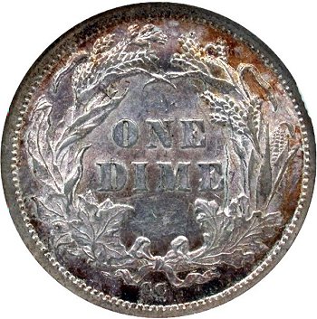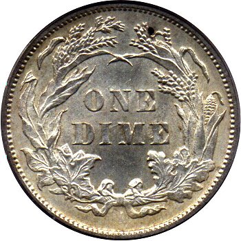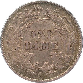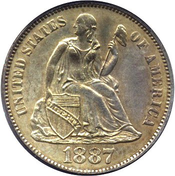 Comments: An extra flag of 1 digit is visible between the 8th and 9th vertical shield lines. The best way to cherry pick this misplaced date is to look below the R in LIBERTY on the scroll for the flag of the 1 digit. This variety was first identified by Gerry Fortin at the 2013 FUN show and is one of the few MPD varieties for the 1887 date. At this time, the rarity is unknown but considered scarce given the number of 1887-S dimes examined by variety collectors without noting an obvious 1 digit in the shield.