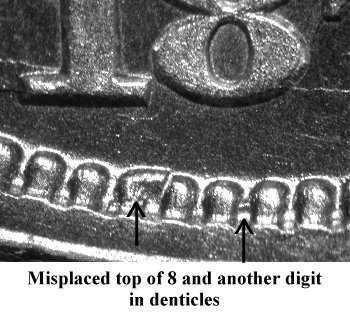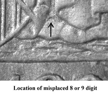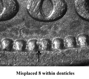 Comments: The top of an extra 8 digit is found in the denticles below the final 8 digit in the date. This variety must be located first hand otherwise high resolution digital images are required to cherrypick from online retailers or auction house. Chris Pilliod first identified this variety and used the Gorecht Journal for announcement. Also listed in the Ultimate varieties set.