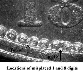Comments: Two extra digits are seen in the denticles below the final 18 digits in the date. The first extra digit could be an extra 1 or 8 and is obvious to the trained eye seeking MPD varieties. A circular die line in the shield could also be another misplaced digit. I have only seen one example, the plate coin as listed in the web-book. First published by Larry Briggs and not included in any other variety sets until this time.