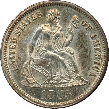 Comments: The top of 1 and 8 digits are found in the denticles directly below the final 18 digits. Locating this variety will take careful searching and first hand viewing of 1885 dimes as online images probably will not offer enough resolution for properly diagnosing this F-103 variety. First published by Gerry Fortin in the Gobrecht Journal during 1995. I have seen few examples since that time. First listing within speciality Seated dime variety set.