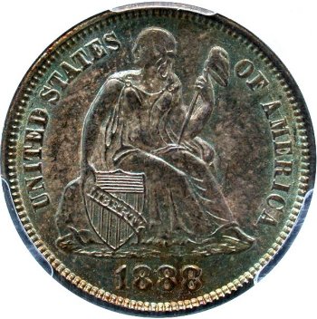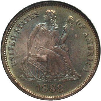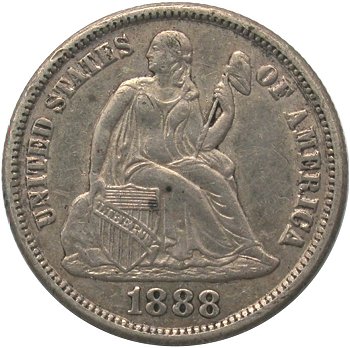 Comments: This 1888 variety presents one of the few triple digit misplaced dates in the Liberty Seated dime series. The lower end of the scroll bisects the top of the first 8 digit. The top of the middle 8 digit is visible to the left of the pendant while the top of the final 8 digit is well defined and visible to the right of the pendant. Discovered by Gerry Fortin in the mid 1990s. Searching for this misplaced date variety should be done on dimes grading at least VF and probably EF at a minimum since wear will remove the second and third misplaced digits on well circulated coins. This MPD variety is rare and will take patience searching and some luck to locate. My suggestion is to focus on TPG holdered 1888 dimes are auction or on eBay. The variety is also included in the Top 100 and Ultimate variety sets.