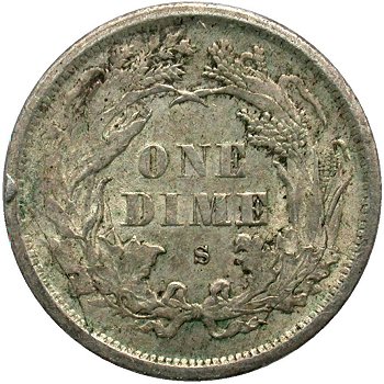 Shattered Reverse Die, spectacular die cracks form a radial inner ring that covers about 60% of the wreath and has four entry points to the rim. The die crack from bow knot down to rim at right side of S mintmark is necessary for variety. | |